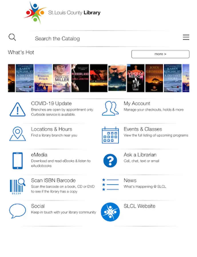 St. Louis County Library is on the go and open 24/7 with SLCL Mobile! You can manage your account, search the catalog, renew and request material, download eMedia titles, view upcoming events and classes, locate the closest SLCL branch, Ask a Librarian for help via phone, chat, email or text from your device.