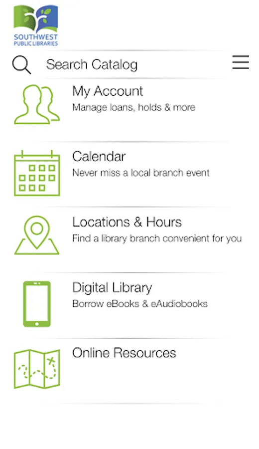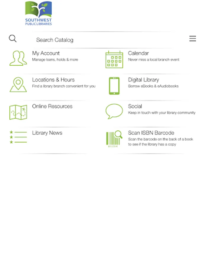 Access Southwest Public Libraries from your mobile Android device. Manage your account, search the catalog, renew and reserve books and access e-books and other digital materials. Check out our calendar for programs, story times & other events at the Grove City and Westland Area Libraries.