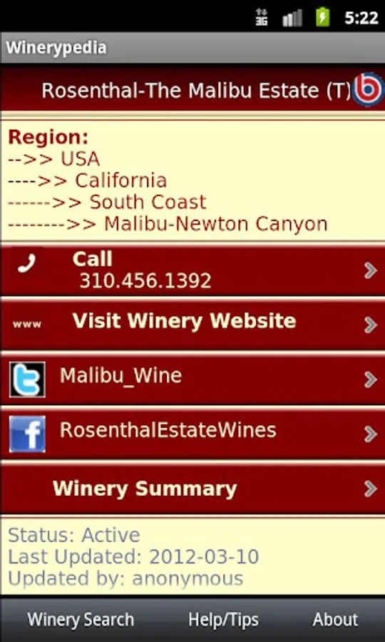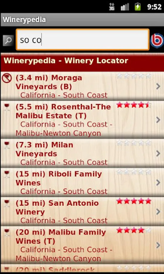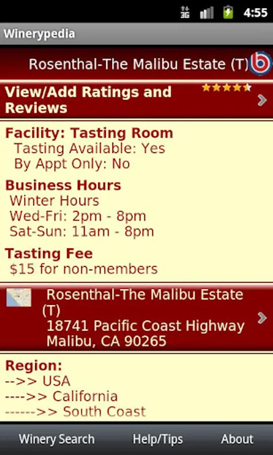 Winerypedia Winery Locator provides real-time distances to wineries on GPS enabled mobile devices. The locator also enables quick search capabilities based on winery name and/or region. It provides tasting information, one-click phone dialing & emailing, and one-click mapping using GoogleMaps. With a database of over 5800 wineries and growing, Winerypedia is a wiki-style web site that allows users to update winery information at http://www.winerypedia.com/. The mobile application is useful for wine enthusiasts traveling to wine country, as well as business travelers who may be surprised to find a winery/tasting room nearby. Note that this application requires carrier OR WiFi coverage! It will work without GPS functionality, but the true power of the application will be missed.