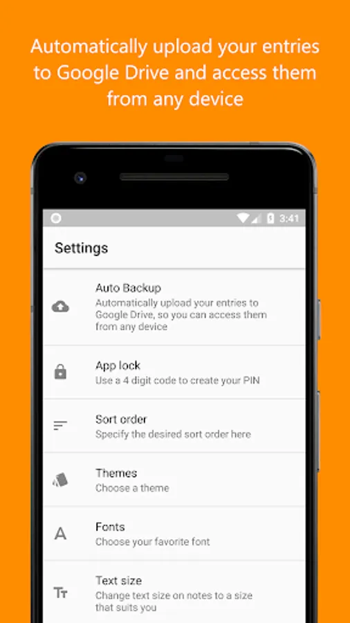 Dearest Diary backs up your entries to Google Drive, so you not only can access them from any device, but you are able to retrieve your entries from any location with an internet connection. Taking advantage of this great feature gives you peace of mind that your entries are all safe, secure and accessible at any time and from anywhere.