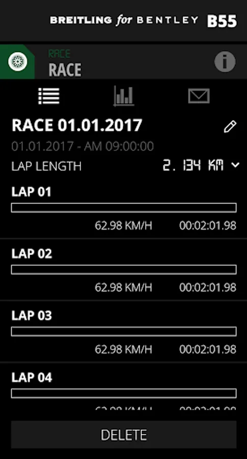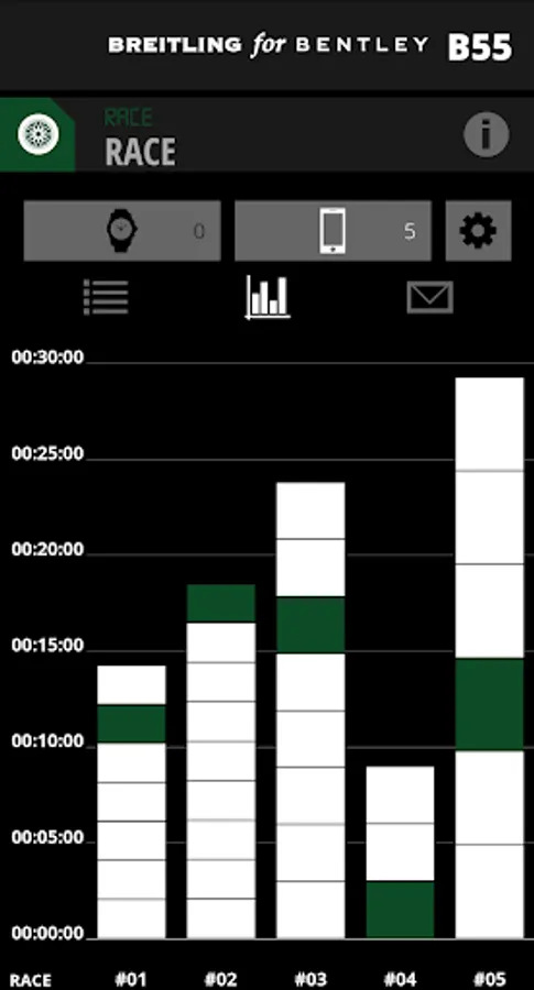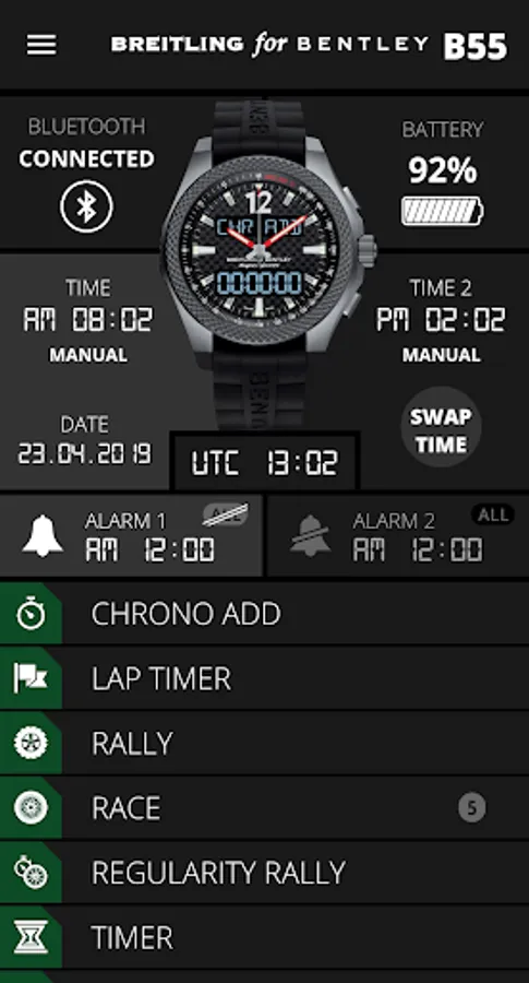 The B55 RACING app enables the user to verify and adjust at a glance the main settings of the Bentley Supersports B55 chronograph, as well as swiftly access its different functions. The smartphone’s memory enables the different chronograph measurements to be stored so that they can be seen, compared or even transferred to other apps. The smartphone’s screen offers unparalleled reading comfort, thus bringing a new dimension to stored data.