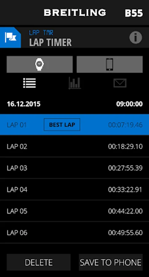 The YACHTING application allows the user to verify and adjust the main settings of the EXOSPACE B55 YACHTING chronograph at a glance, but also to have rapid access to its different functions. The smartphone memory allows the different measurements of the EXOSPACE B55 YACHTING chronograph to be saved so that they can be viewed, compared or even transferred to other applications. The smartphone screen offers unparalleled reading comfort, thus giving stored data a new dimension.