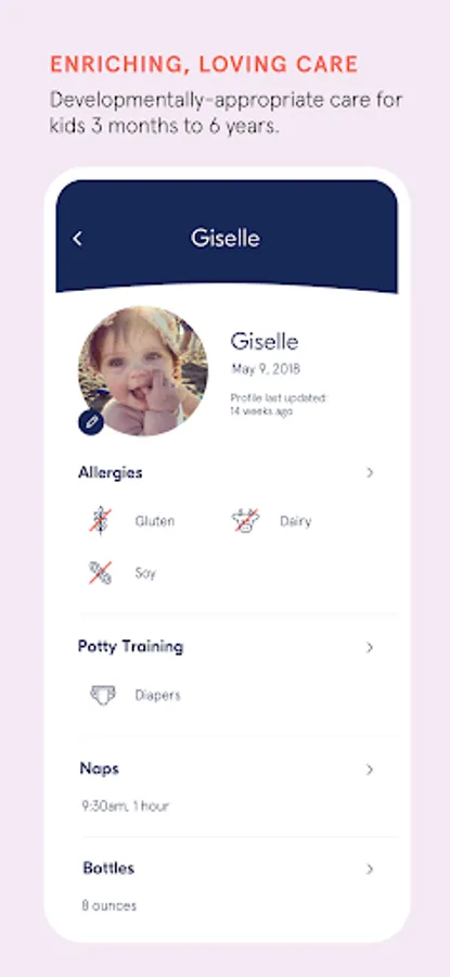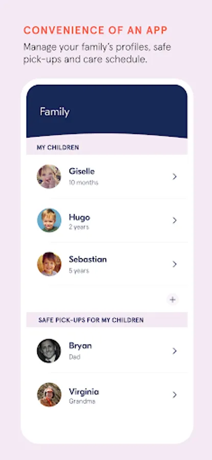 Our mobile app manages your family profiles, as well as safe pick-ups and child care schedules.