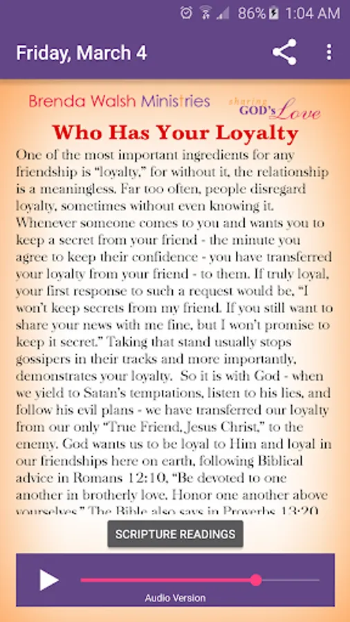 Start your day with an inspiring one-minute devotion that will draw you closer to Jesus and have you praising Him all day long! You’ll receive a new thought-provoking devotion each day that will encourage, comfort, and teach you about God’s amazing love, grace, and mercy. There is scripture for each devotion written out to make it easy for your to read God’s Word. An audio version is available where you can listen to Brenda read her devotions. You can also share the devotions with others via Facebook, text message, or email.