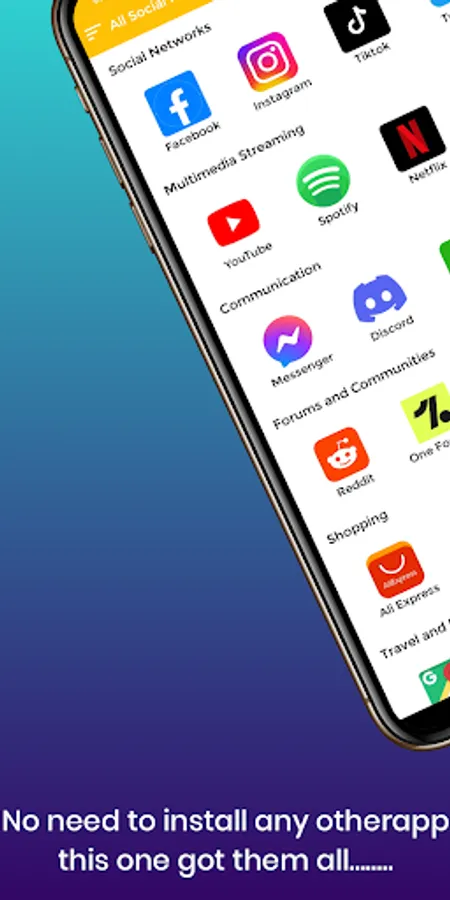 All social media app is a comprehensive platform that allows users to connect, share, and engage across multiple social networking sites. With this app, youcan easily stay connected with friends, family, and colleagues across various platforms such as Facebook, Instagram, Twitter, LinkedIn, and more. Seamlessly navigate through different social media feeds, post updates, photos, and videos, and interact with others through commentsand likes. This all-in-one social media app eliminates the need for switching between different apps, providing a convenient and efficient way to manage your online presence. Discover trending topics, join groups and communities, and stay updated on the latest news and events happening in your network. With advanced privacy settings, you have complete control over your online profile and can choose who sees your posts and personal information. Whether you want to share your everyday moments, promote your business, or simply stay connected with the world, this all social media app offers a seamless and comprehensive experience.