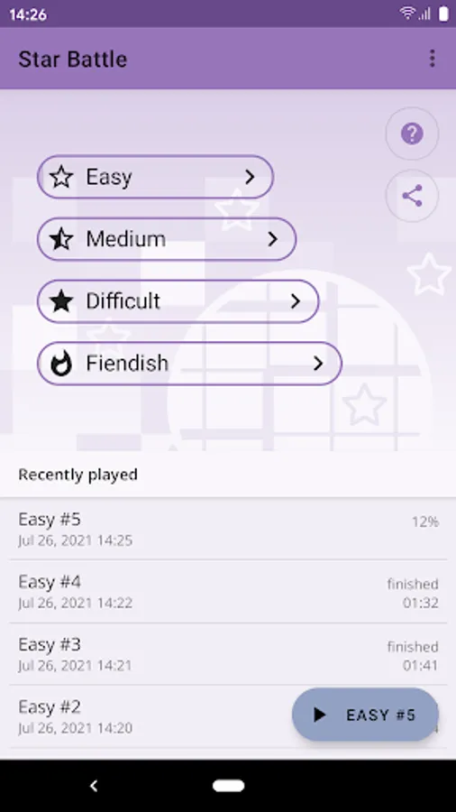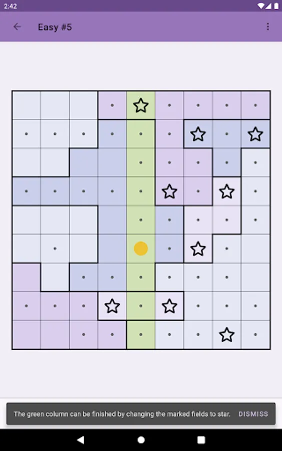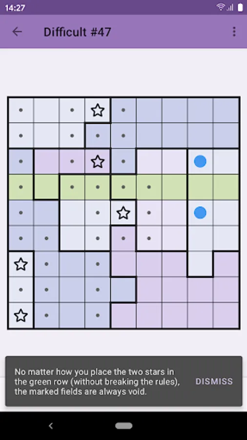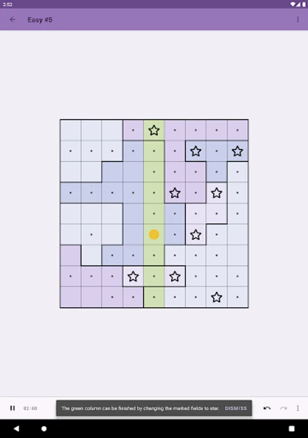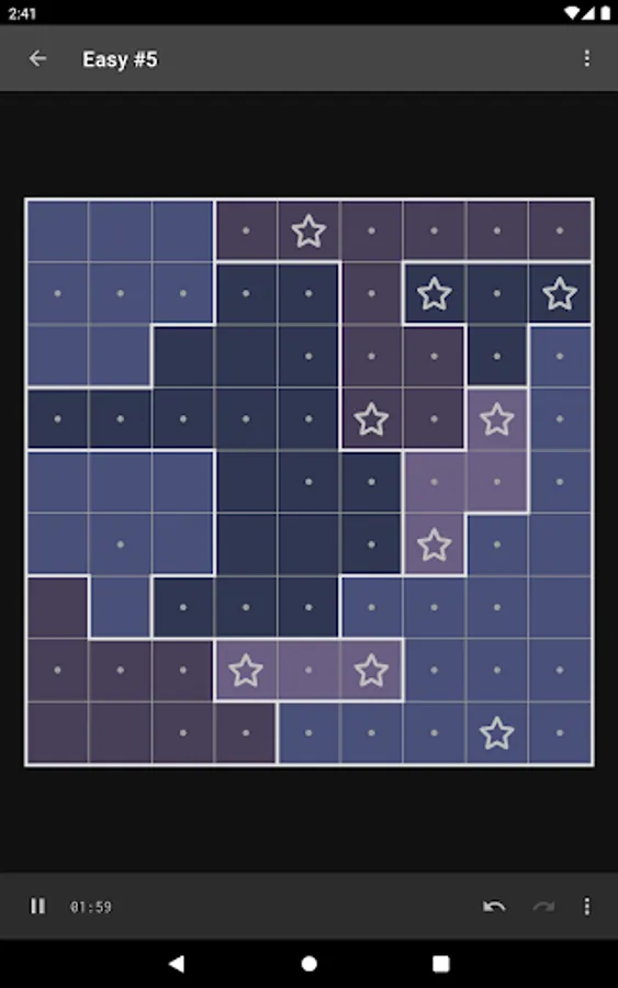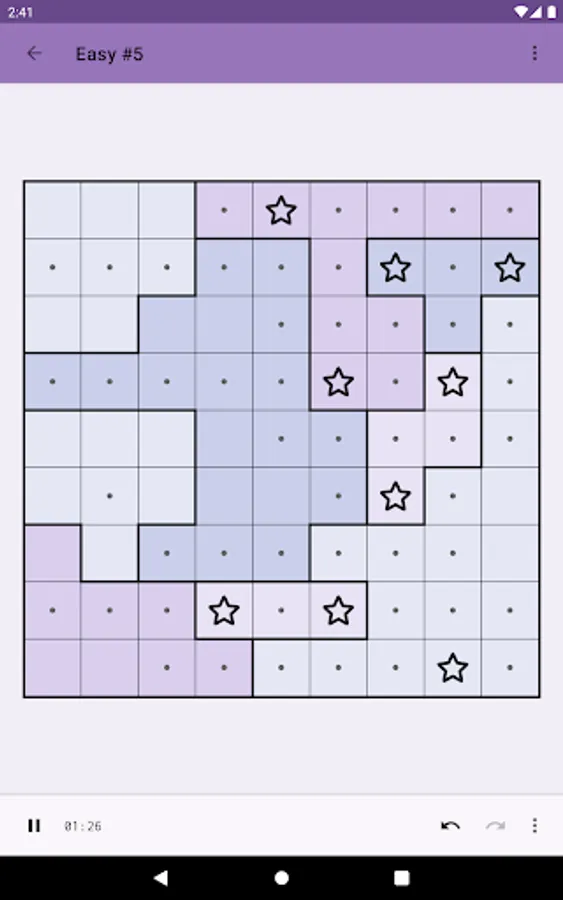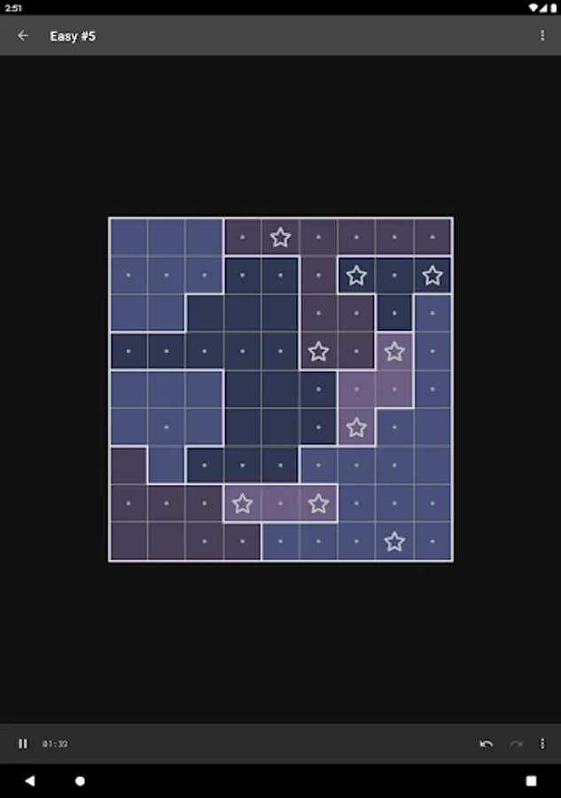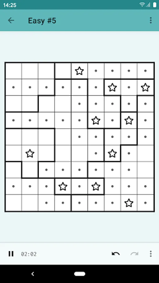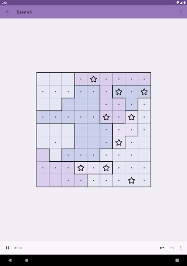 Star Battle (also known as "Two Not Touch") is a challenging logic puzzle. Place two stars in every row, in every column, and in every region, but make sure that the stars do not touch! Each puzzle has only one solution, which can be reached with logic reasoning, no guessing needed!