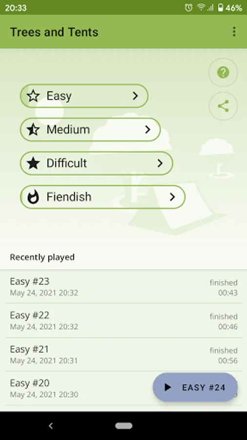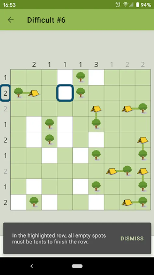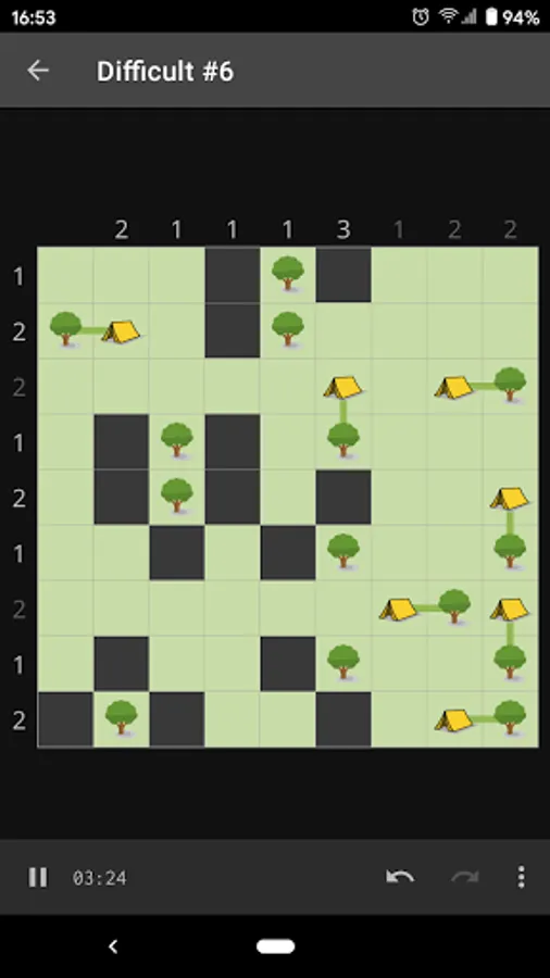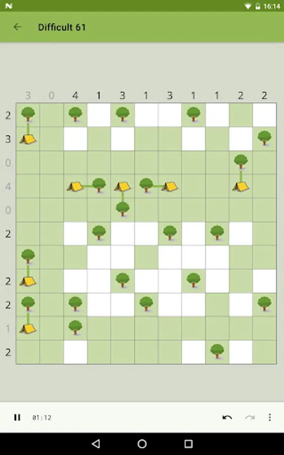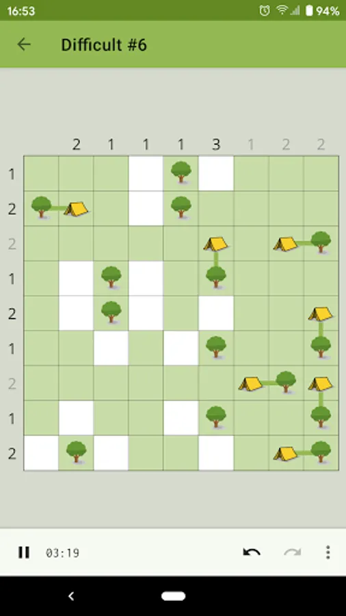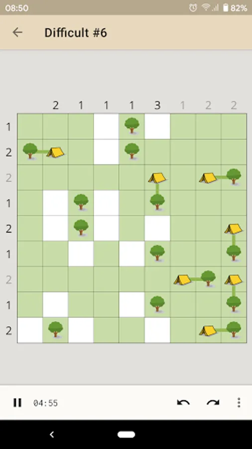 Trees and Tents is a challenging logic puzzle. Place a tent next to every tree on the grid, but make sure that the tents do not touch! The numbers around the grid tell you how many tents should be placed in a row or column. Each puzzle has only one solution, which can be reached with logic reasoning, no guessing needed!