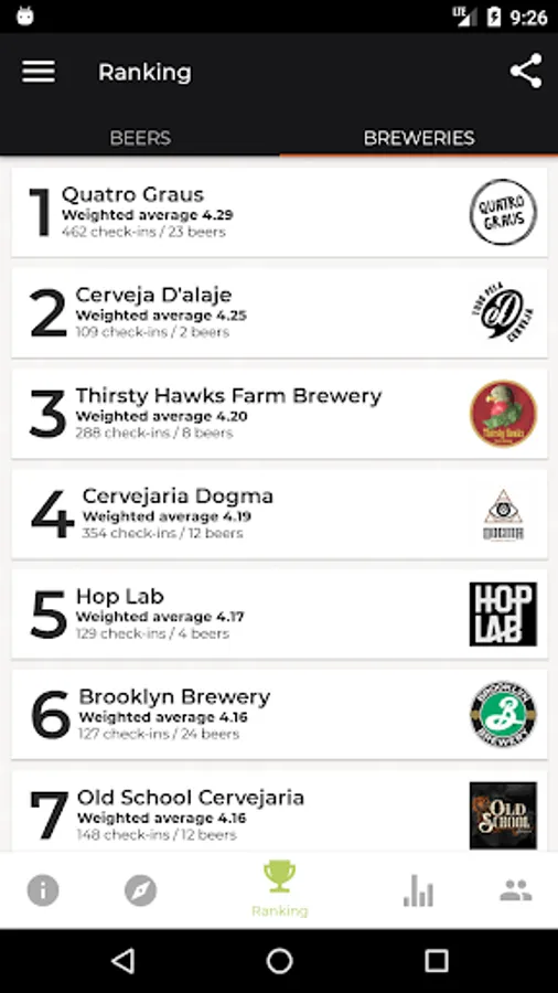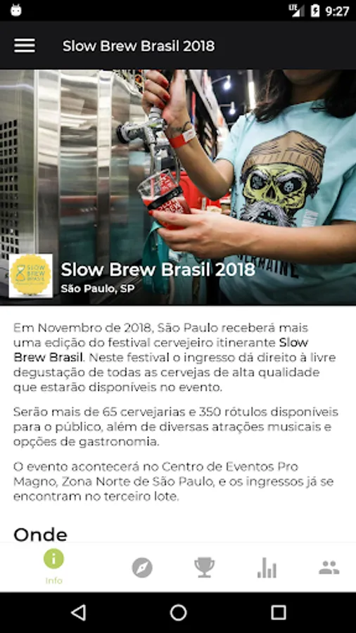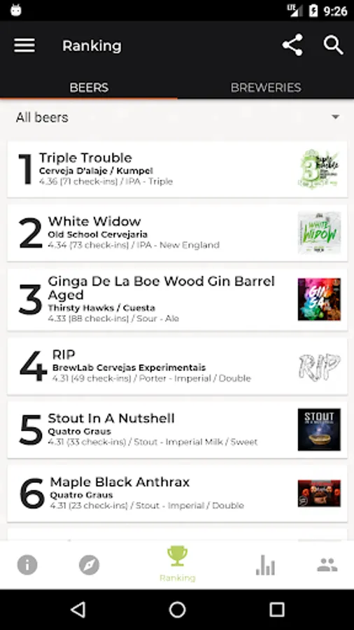 Follow a real time top beers list and improve your festival experience focusing on the best options available. A timeline notifies you when a new beer is served or highlighs check-ins in beers from experienced users on Untappd during the event.