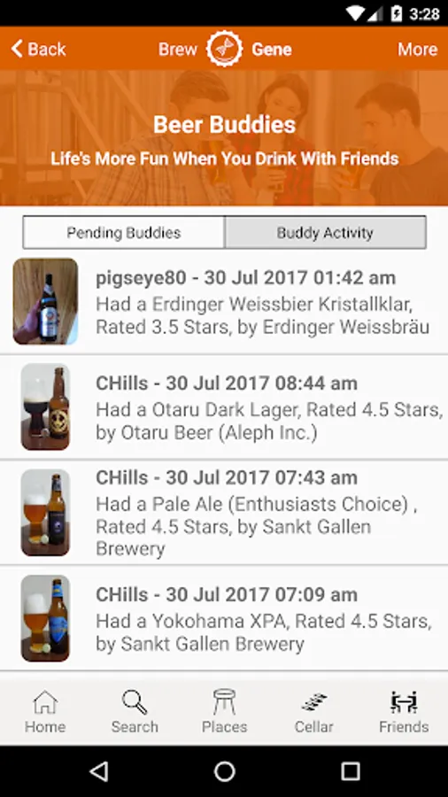 If you're the type of person who likes to post pictures or talk about your favorite beers, we've hooked up BrewGene to Twitter, Facebook and Foursquare. We've also built a Beer Buddy system that allows you and your friends to easily see each other's tasting notes, beer activity, and offer personalized beer recommendations. For instance, if you need to get your buddy some beer for their birthday, you can search and see their favorite beers.