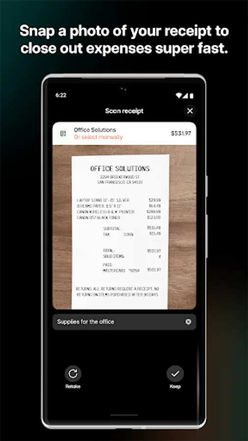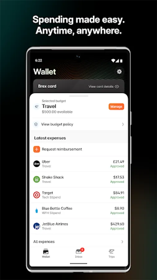 The Brex mobile app gives you full, fast access to your Brex account and card. Use the app to make purchases, check spending limits and policies, submit expenses, request or approve reimbursements, send payments anywhere, and more.