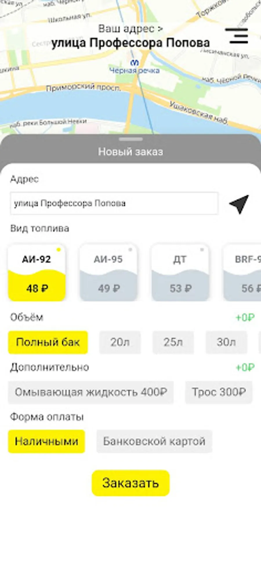 The BRFUEL app is a mobile gas station that allows you to order fuel delivery to your car in St. Petersburg and fill your car at the best prices. Gasoline and diesel fuel are cheaper than at a gas station, so you don't have to wait for hours - just order the right type of fuel for immediate delivery and refueling! We offer a wide range of fuels at low prices. There are 4 types of gasoline to choose from: AI 92, 95, premium BRF 98 and BRF 100, as well as diesel fuel.