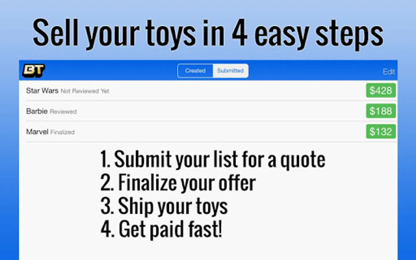 - Get a quote from Brian’s Toys when you scan and submit your collection with the Sell My Toys® app