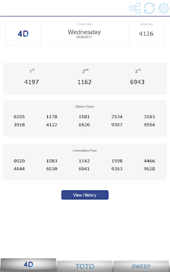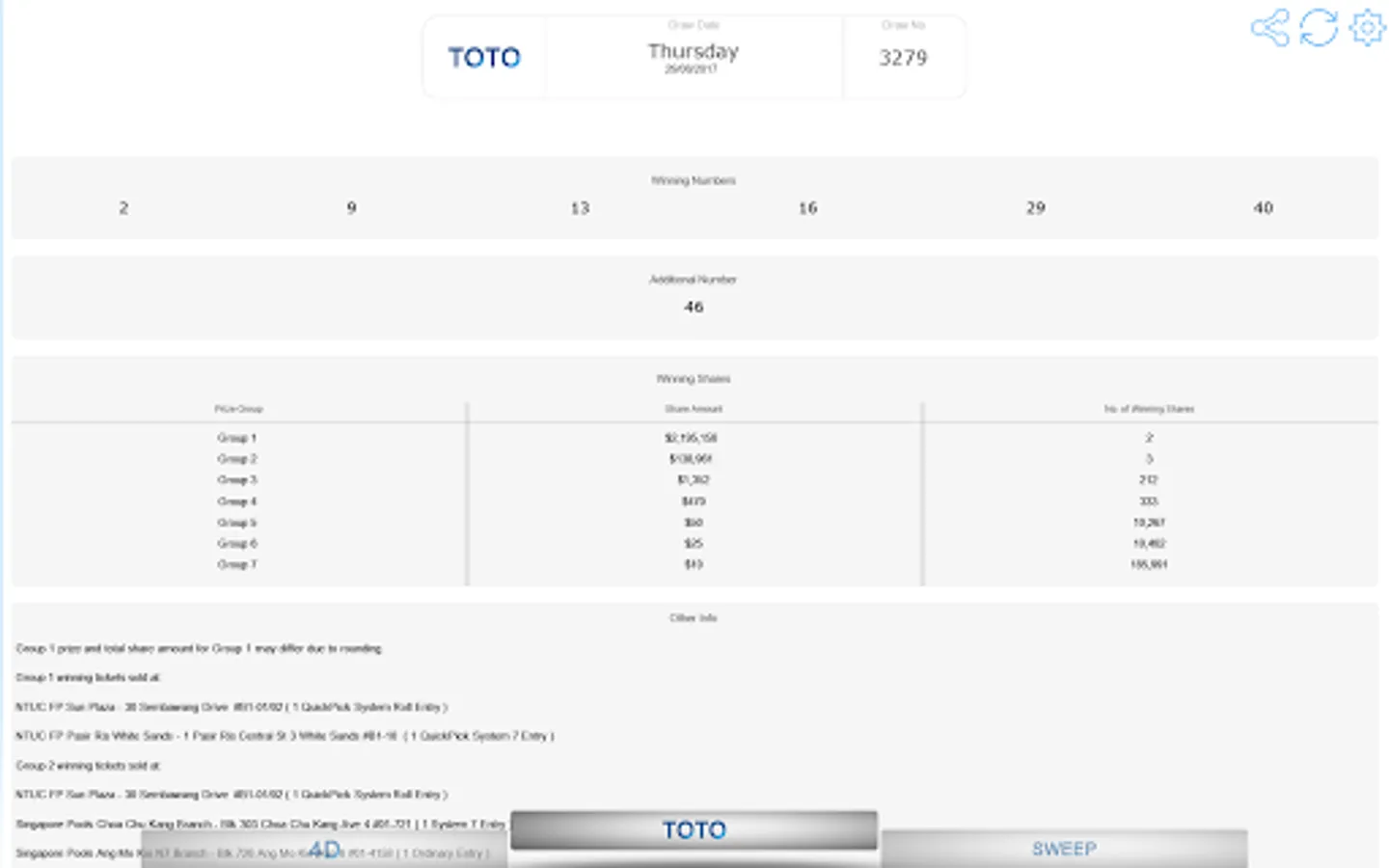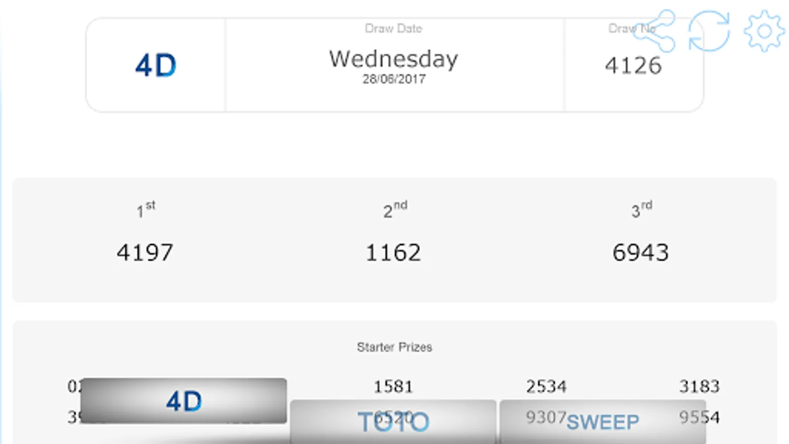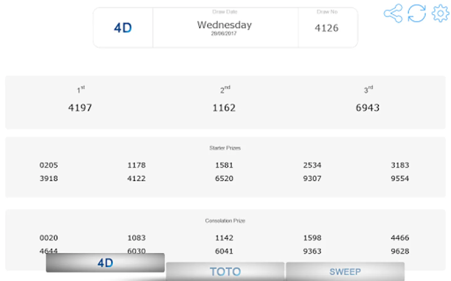 View 4D results for Singapore. Results are updated every Monday, Wednesday, Thursday, Saturday, and Sunday with a notifications. Results category are shown in the app's respective pages.