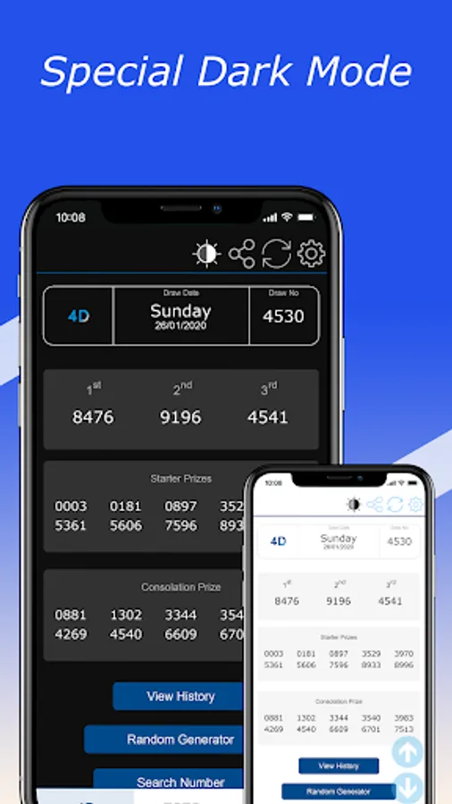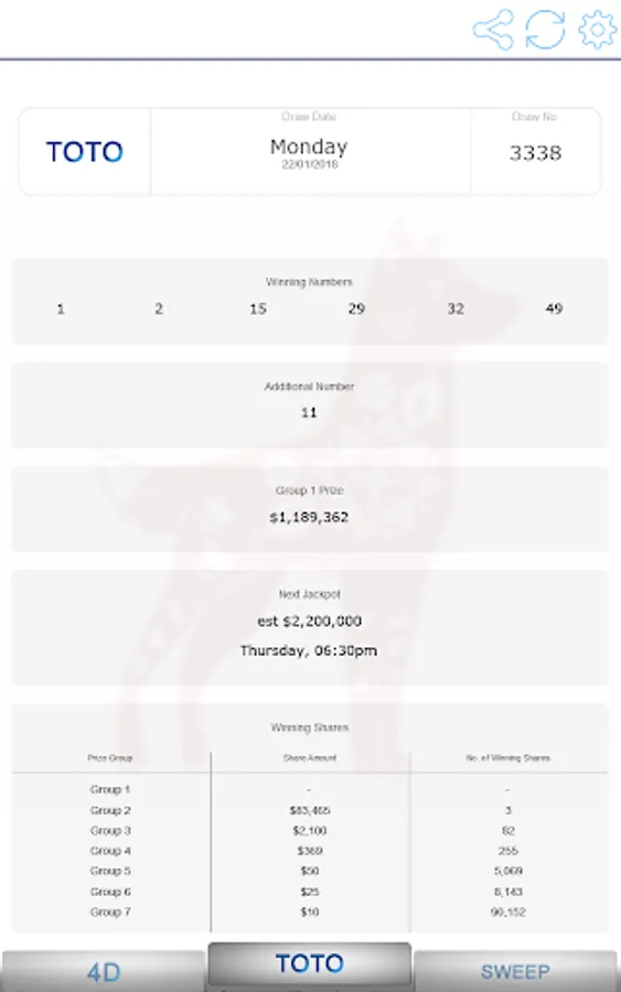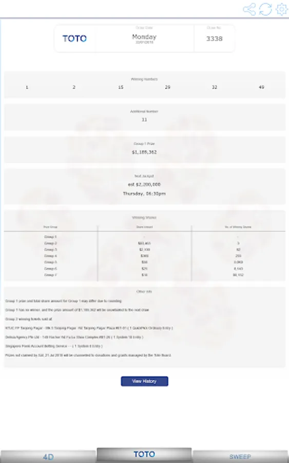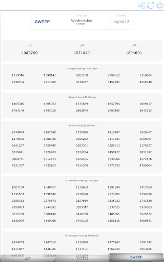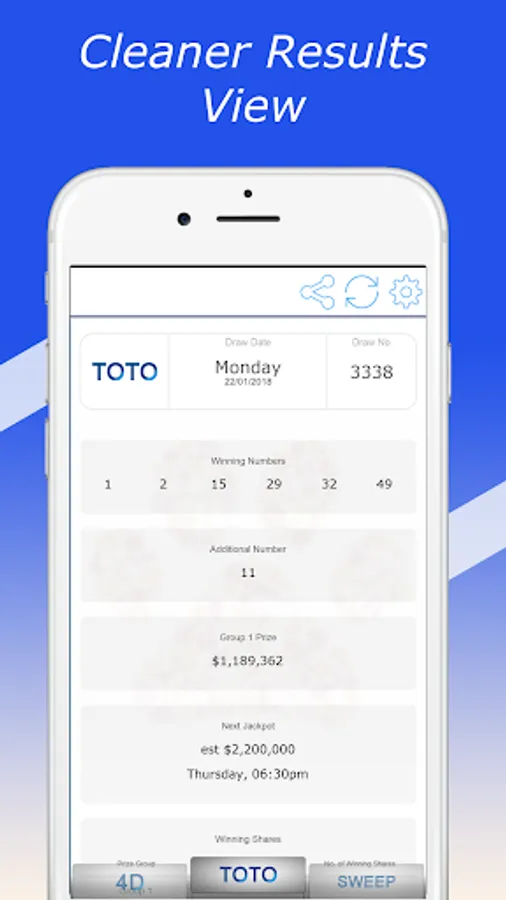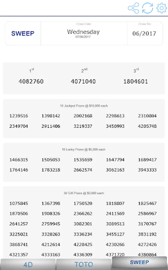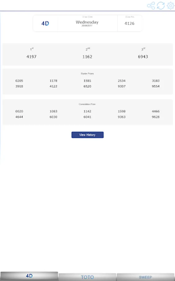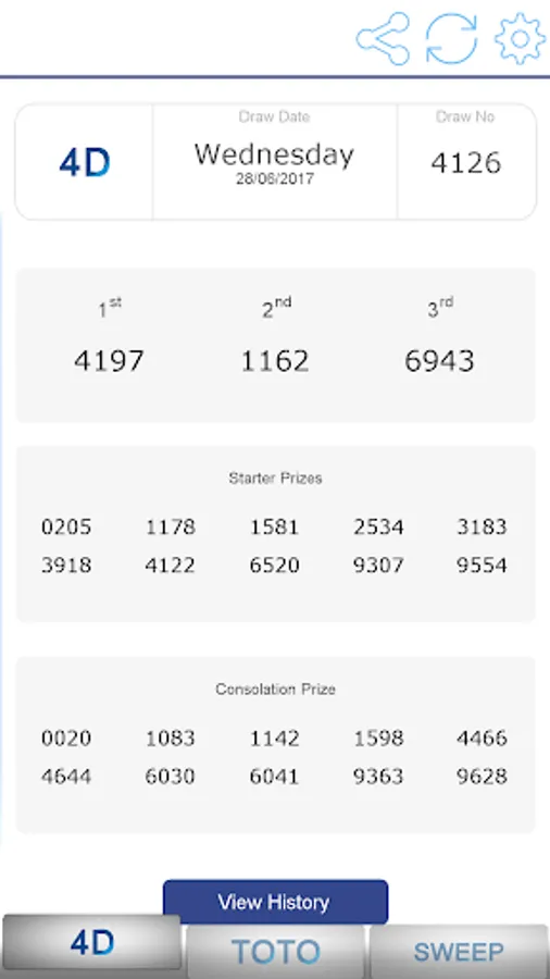 View 4D results for Singapore. Results are updated every Monday, Wednesday, Thursday, Saturday, and Sunday with a notifications. Results category are shown in the app's respective pages.