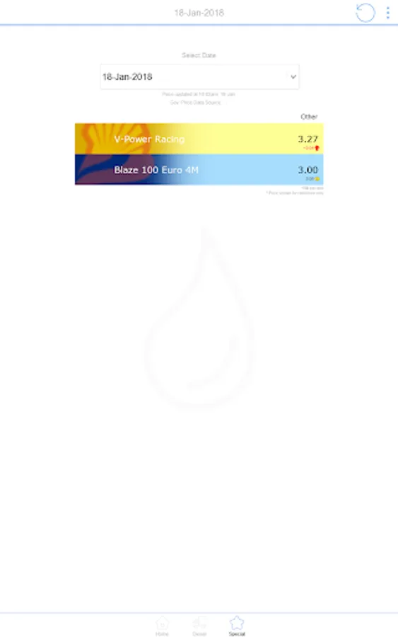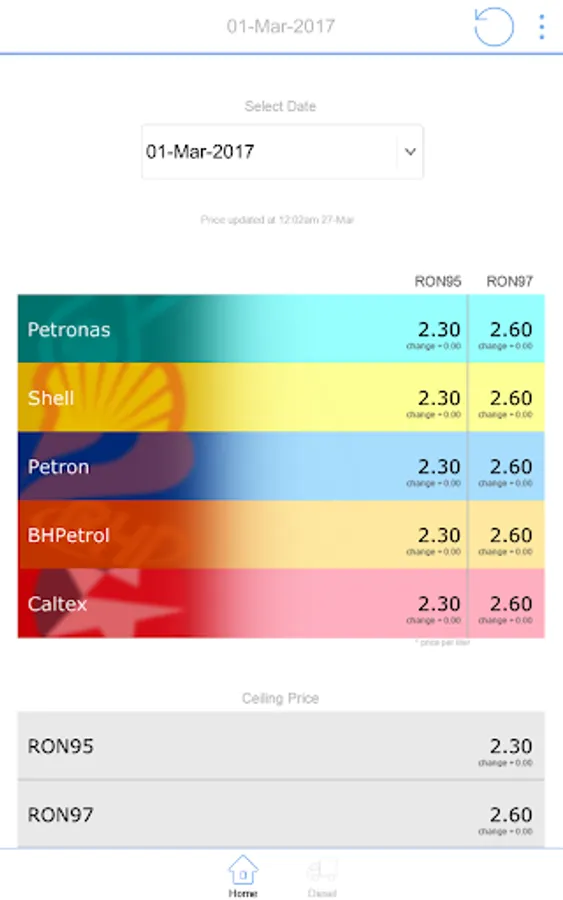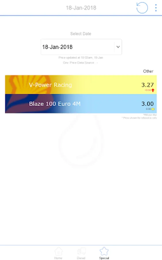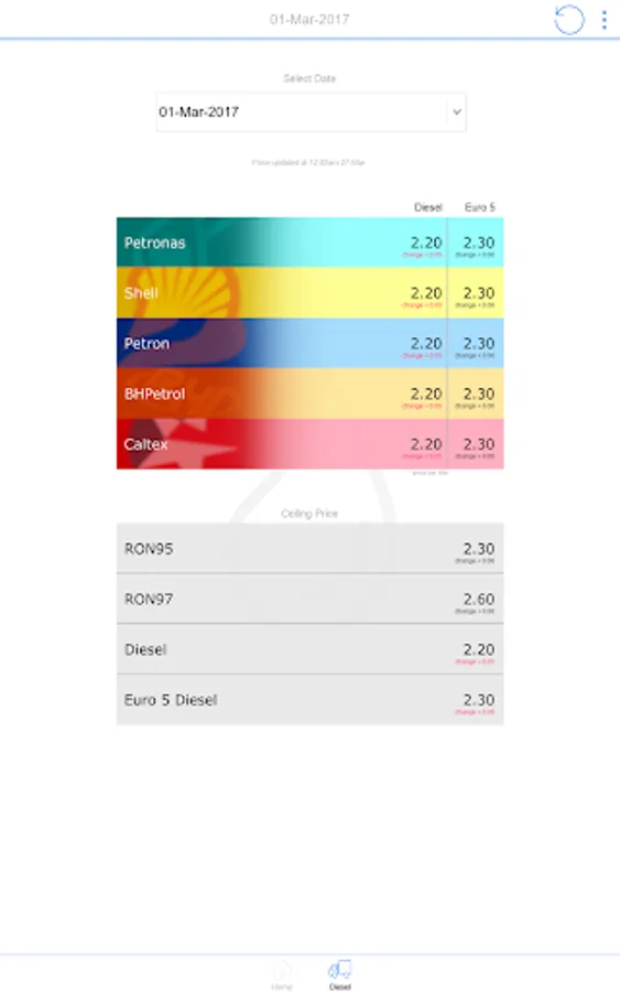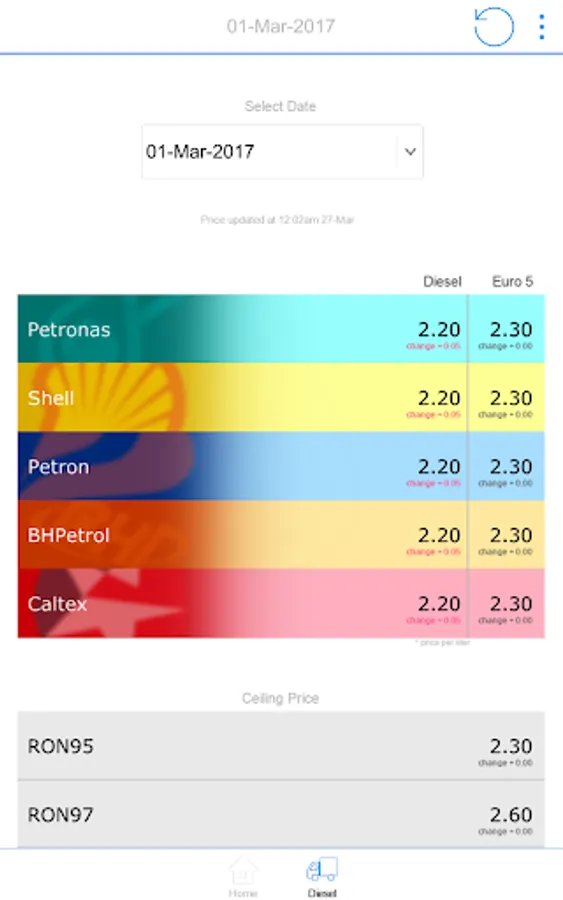 - Shows RON95, RON97, Diesel, Euro 5 Diesel prices.