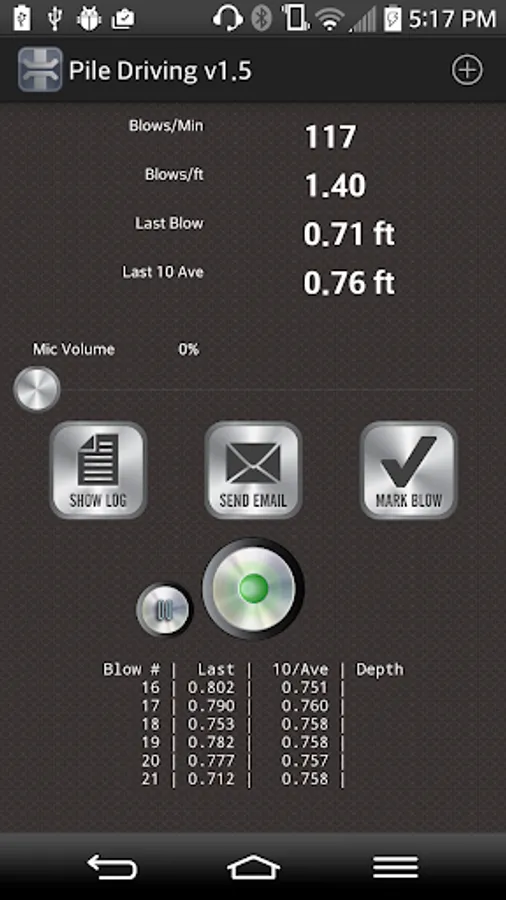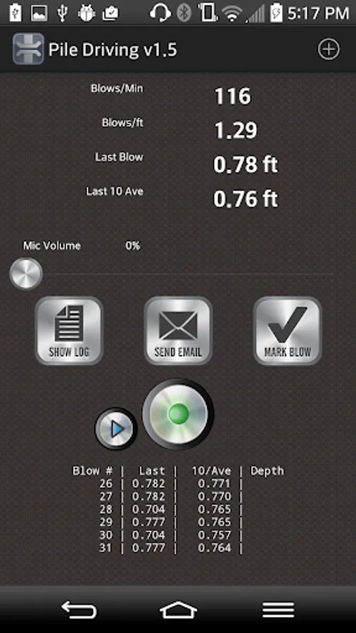 from the sound of the pile driver. This easy to use App works by using the mobile device's microphone which allows the user to keep a real time log of stroke height, blow count, blows/min. pile tip elevation or depth and moving average of stroke height.
