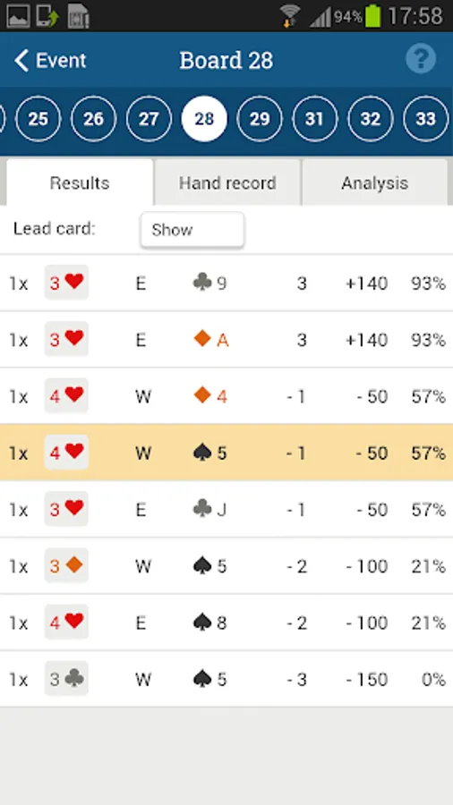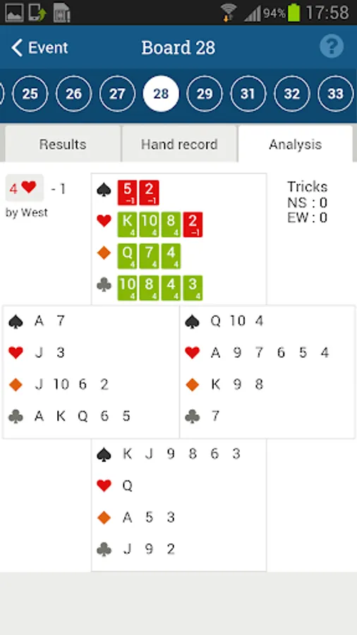 - An interactive analysis of the boards you’ve just played. For each possible card you could have played, the app tells you how this would have affected your board result.