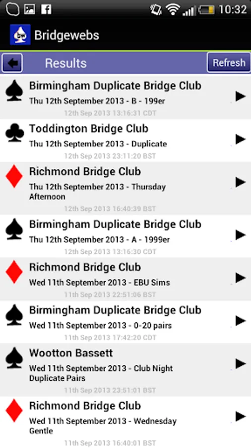 The Bridgewebs app allows users to access details of their Bridgewebs web sites directly on their smartphones and particularly focuses on the latest information. It can be personalised so that you can enter which clubs you play at and then you can quickly see the information for all the clubs selected. There is no need to switch to pages for each club.