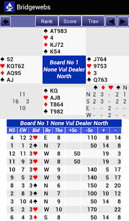 The Results View shows details similar to the club web site including Personalised Score Cards, Boards and Hands where available. Due to the size of screen some information is omitted.