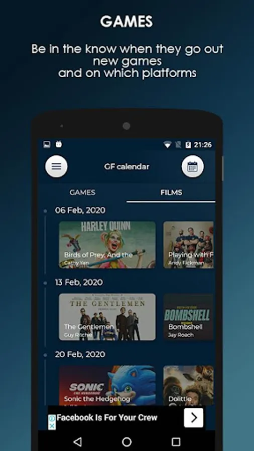 No need to google “movie poster”, “best games in 2020”, “movie release calendar” or “game release calendar” - run our application, everything is there.