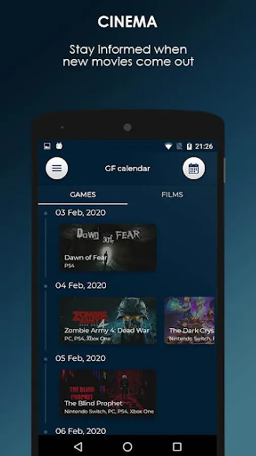 The application has a convenient calendar: select a month, a year and you will see a list of films or games that will be released this month. Our application already has data that is available in the current month. All of them can be viewed in our application - Calendar of films and games.