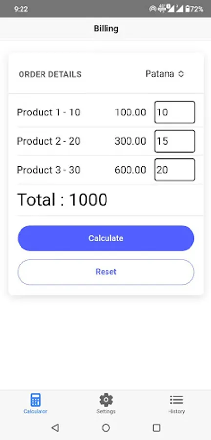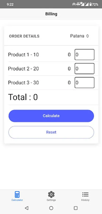 Moving to the Calculator screen, you'll find a comprehensive list of the products you have added from the Settings screen. Each product entry includes its name, price, and a convenient quantity input box. This allows you to enter the desired quantity of each item, making it easy to calculate the total price accurately.