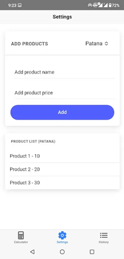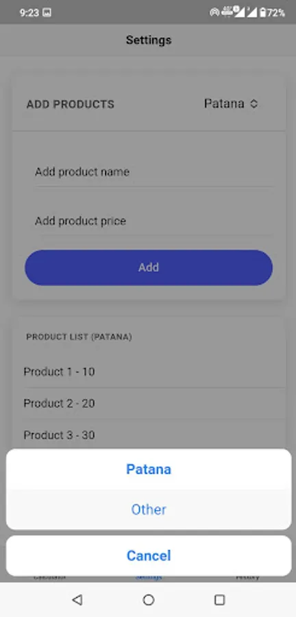 In the Settings screen, you can effortlessly add products along with their corresponding prices. Simply enter the product name and its price, and Gayatri Provision will store the information for future use. This allows you to create a personalized product inventory tailored to your specific requirements.