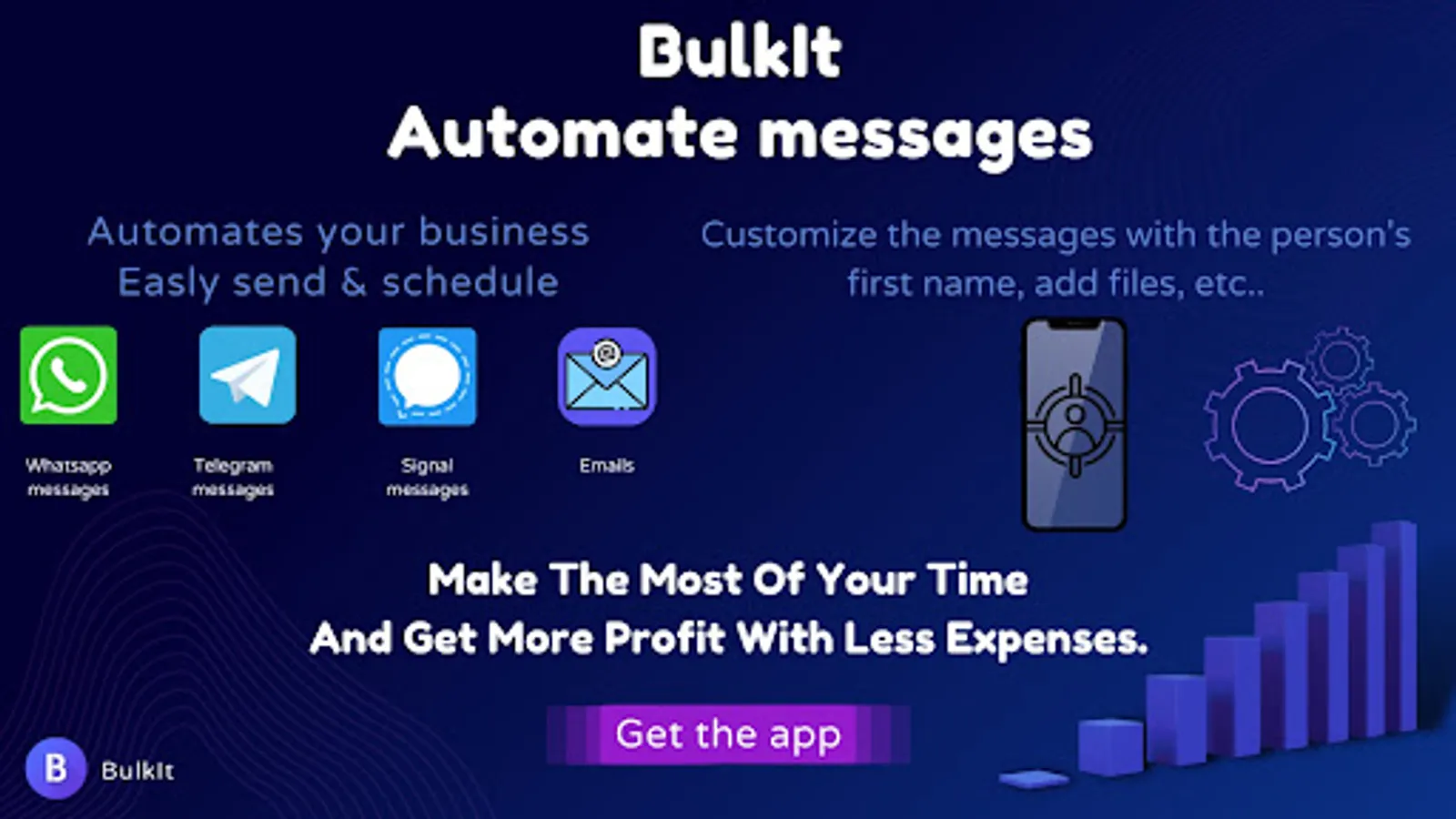 Grow your business with BulkIt, the all-in-one Bulking & Scheduling App that lets you Send or Schedule to send later WhatsApp Messages, Telegram, Signal and Emails to lists. This Bulking & Scheduling app acts like your personal assistant. Boost productivity, save time, and reduce stress!