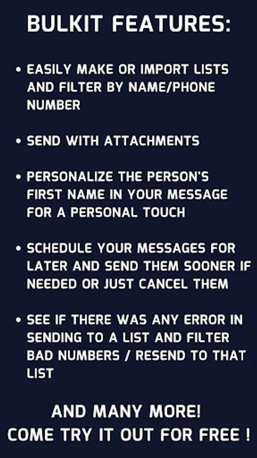 - Let BulkIt do the hard work while you focus on other tasks – BulkIt schedules, BulkIt sends, BulkIt replies!