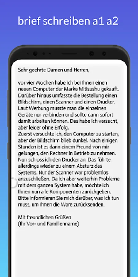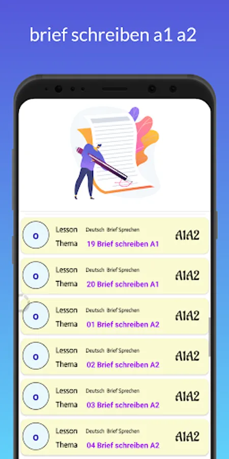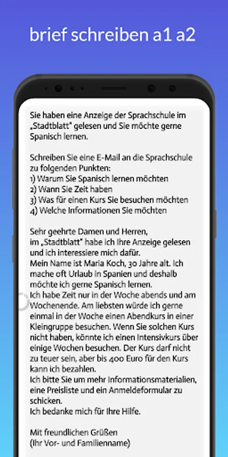 Brief schreiben a1 a2 basiert auf drei Hauptkategorien für Deutsch Lernen. Die Schüler, die ihre Lektionen zu Kurzschreiben a1 und Kurzschreiben a1 a2 lernen werden, sind sehr wichtig für ihr Wissen. Die Schüler sollen die Themen durch diese App Schritt für Schritt lernen und ihr Wissen auf a1 Test erweitern.
