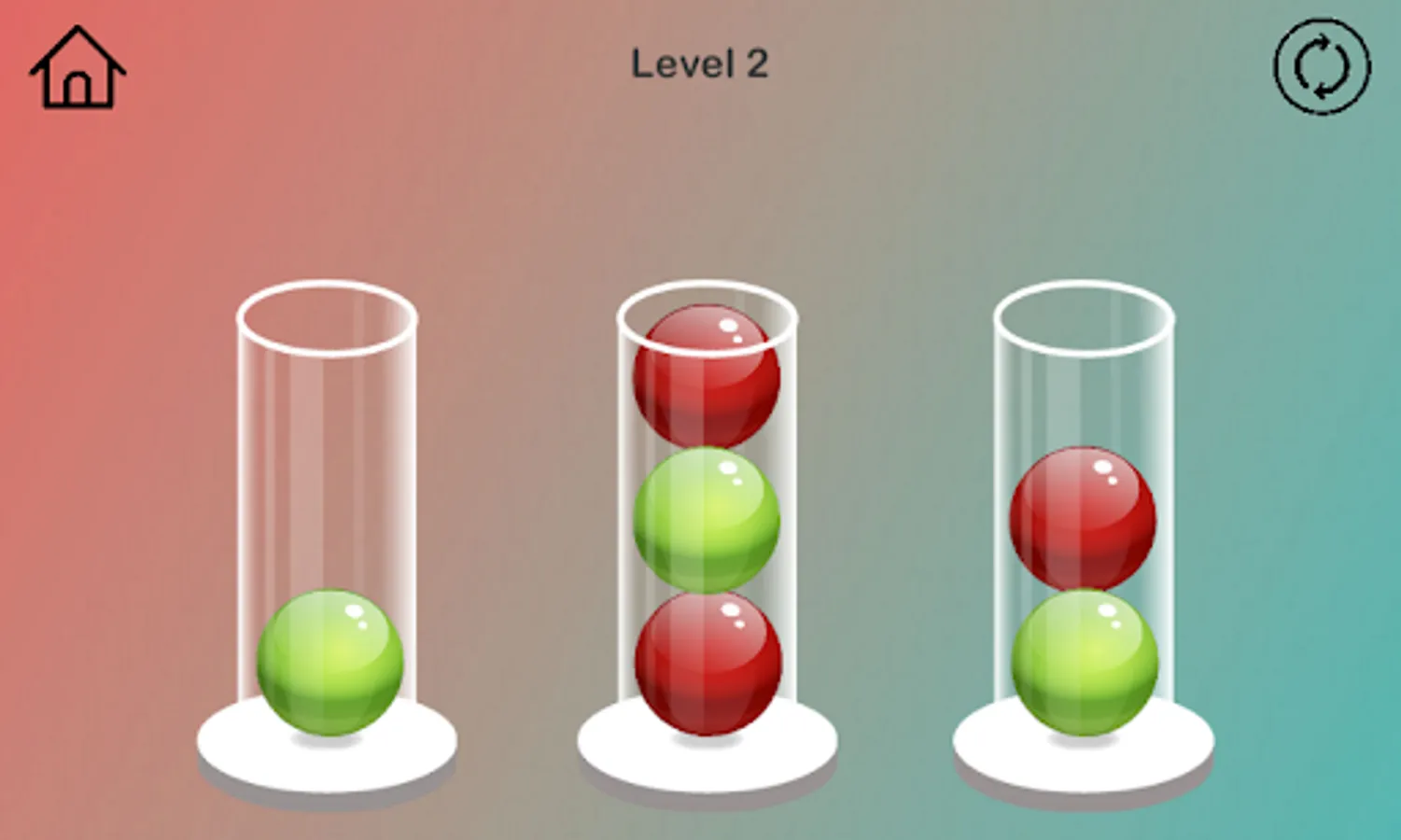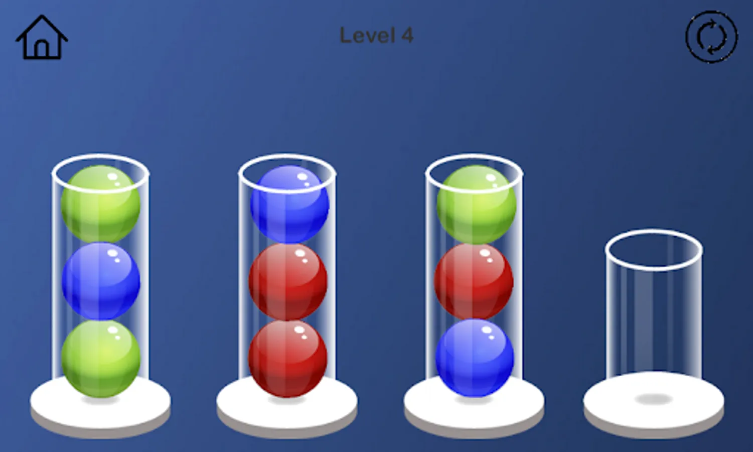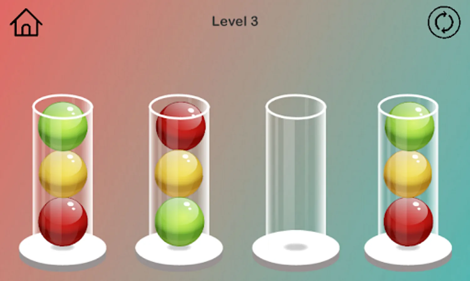 Ball Sort Puzzle Game try to sort the colored water in the glasses until all the colors are in one glass. Challenging but relaxing brain training game!