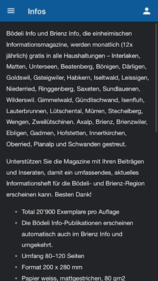 Bödeli Info and Brienz Info, the local information magazines, are distributed free of charge monthly (12 times a year) to all households - Interlaken, Matten, Unterseen, Beatenberg, Bönigen, Därligen, Goldswil, Gsteigwiler, Habkern, Iseltwald, Leissigen, Niederried, Ringgenberg, Saxeten, Sundlauenen , Wilderswil. Gimmelwald, Gündlischwand, Isenfluh, Lauterbrunnen, Lütschental, Mürren, Stechelberg, Wengen, Zweilütschinen. Axalp, Brienz, Brienzwiler, Ebligen, Gadmen, Hofstetten, Innertkirchen, Oberried, Planalp and Schwanden.