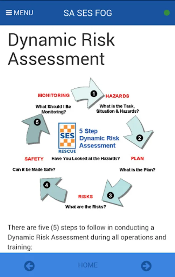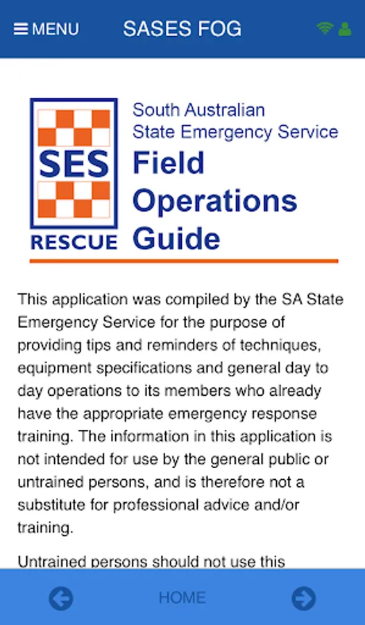 SASES (South Australian State Emergency Service) Field Operations Guide (FOG) is an important operational reference tool for SA SES volunteers and operational staff. The guide contains quick and handy information which will assist with day to day operational activities. The Field Operations Guide is not intended to be a training tool. Rather, it acts as an aide memoire to trained members. The guide supports the SA SES Standard Operating Procedures and SES training manuals in use today.