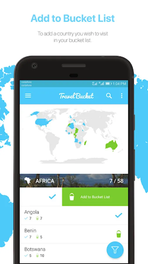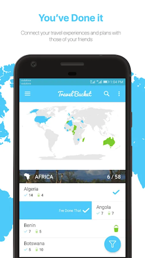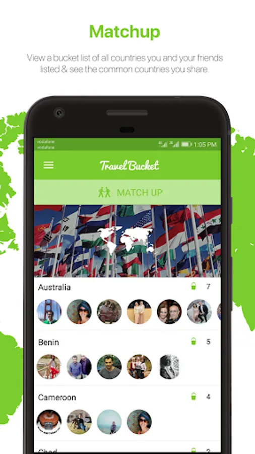 • Match Up – View a bucket list of all countries that are listed by you and your friends & see the common countries you share with friends.