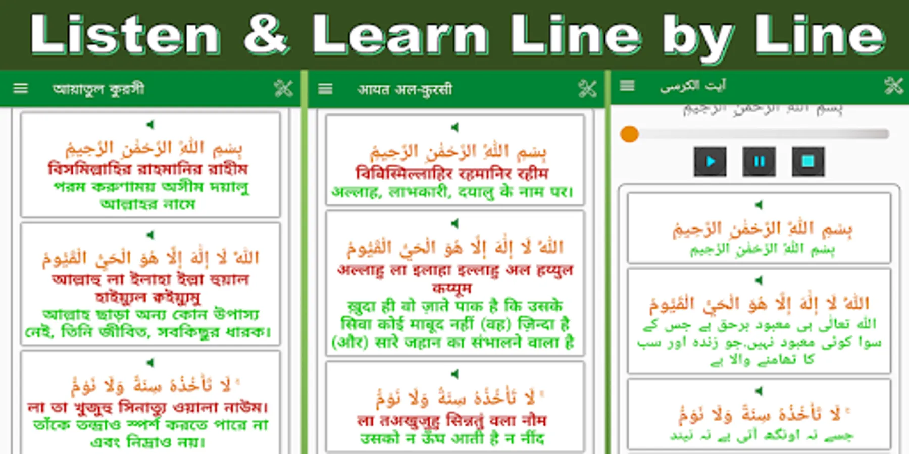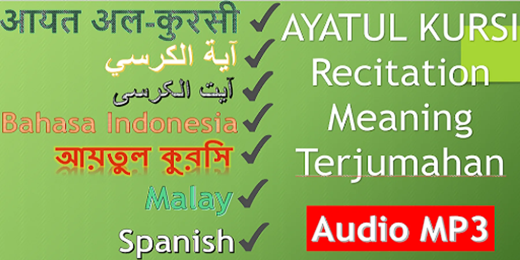 This ayat al kursi app is a multi-lingual app. Ayatul Kursi various language have been included in this app. You can read and listen Ayatul kursi in English, Bangla, Urdu, Indonesian, Malay, Arabic, Hindi , Spanish, Latin. Ayatul Kursi in English has Arabic ayat ul kursi, then English Ayatul kursi pronunciation, then finally English meaning of ayat al kursi.