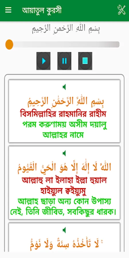 Ayatul Kursi mp3 audio can be paused and stop. There is a progresses bar that will play Ayat ul Kursi mp3 audio in any position.