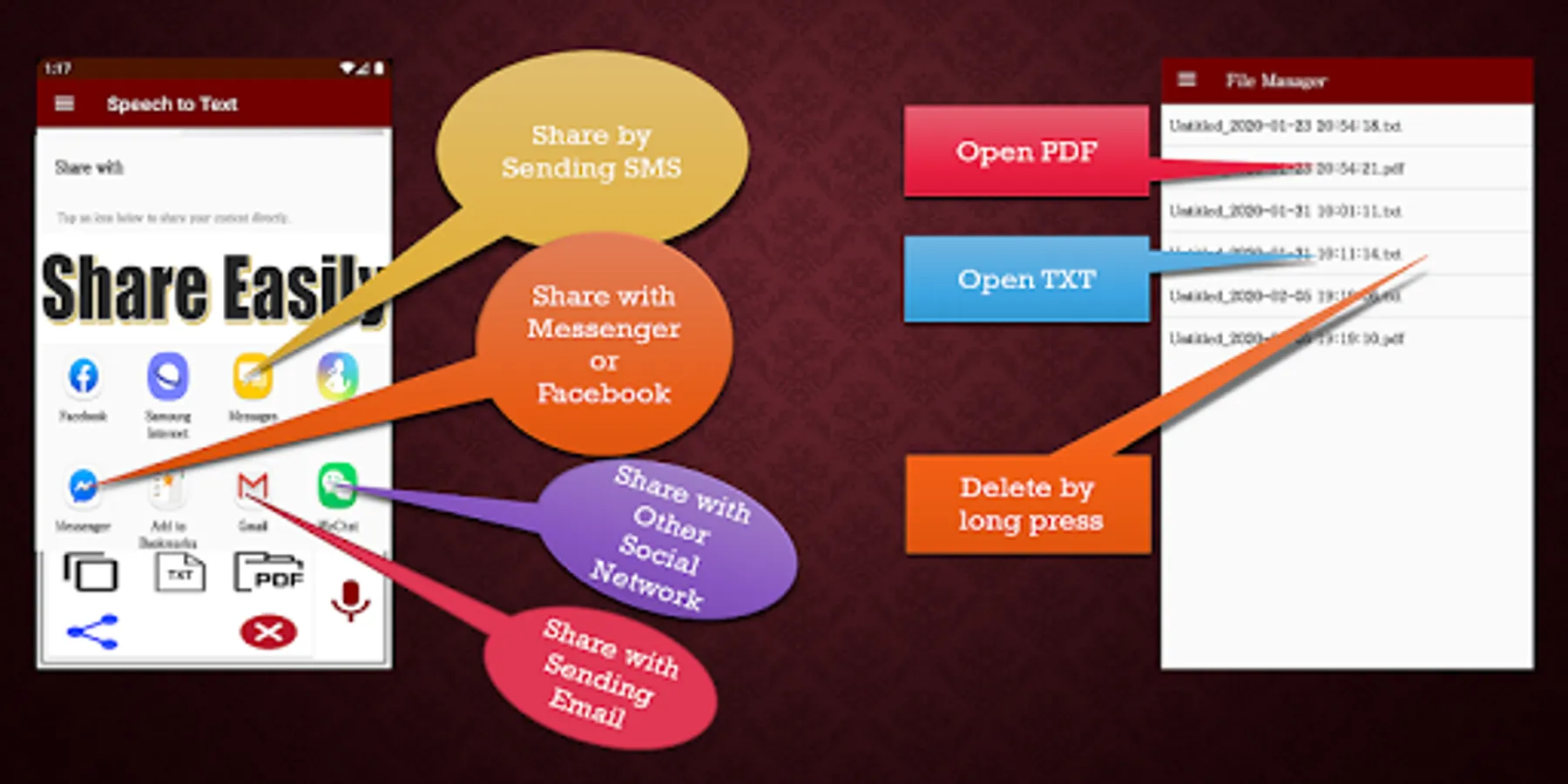 Speech to Text Converter can share converted result by messaging, chatting apps, social media, email etc.