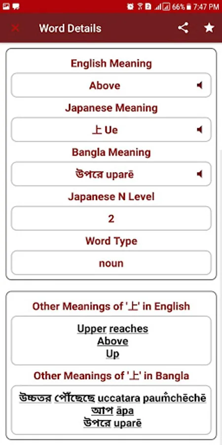 Favorite words: To mark any of the searched word favorite in Japanese English Dictionary, user can mark any of the English Japanese word item favorite by simply tapping on favorite icon.
