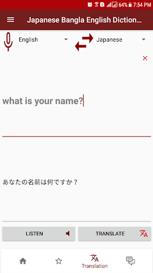 Translator Japanese English app can translate language from English Japanese or from Bangla into Japanese. App has button that can change dictionary mode from Japanese to English or Bangla to English mode by tapping button.