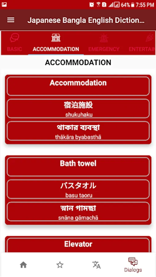 Japanese English Translator is basically designed for the Japanese English Bangla speakers, who have been facilitated with all modes of translation and offline dictionary.