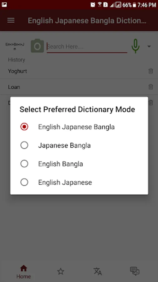 Home: Home screen has Japanese English Dictionary and favorite part. The dictionary has 4 modes. User can switch any mode as they desire for better dictionary performance.