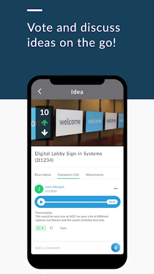 As an idea evaluator, complete your ratings and scorecards on the go anywhere, any time! Too busy to type out your feedback on an idea? Use our audio commenting feature, and leave a voice recording that Brightidea will transcribe into text for you.