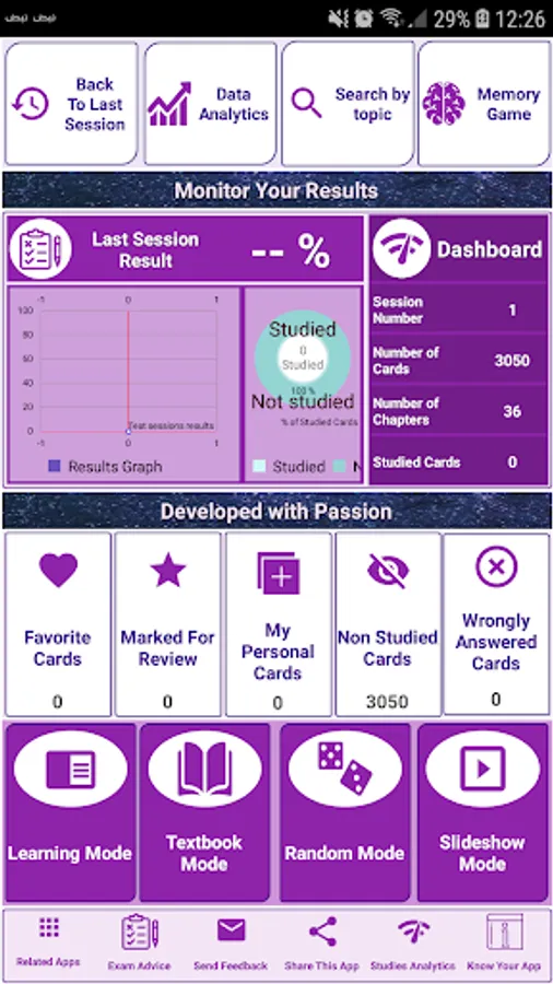 - Get the most advanced data analytics features that analyses your study session by study mode, scores, time spent…etc.