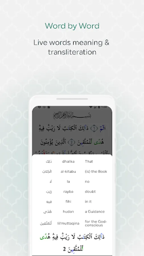 1. Word by word definition (currently available in English only) in addition to Tafseer and translation for each Ayah.