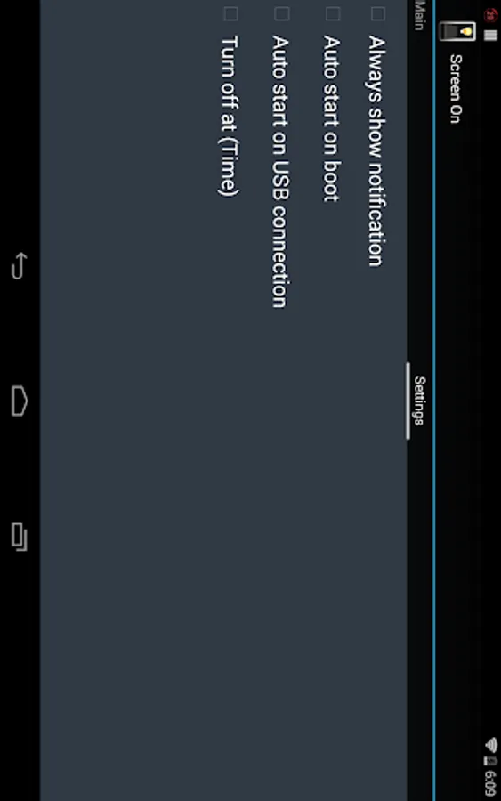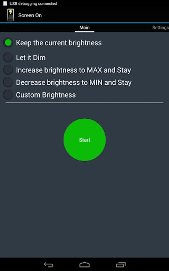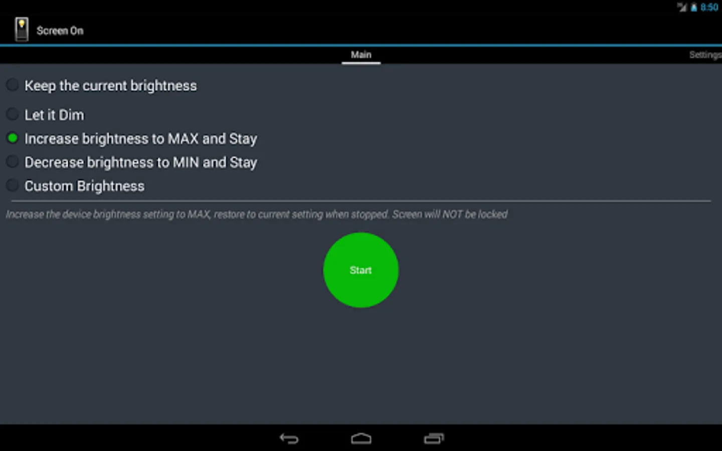 Screen on allows you to keep the screen ON with five options to adjust the brightness preventing the screen to lock and to keep the screen awake . You can set your screen timeout with these five options: