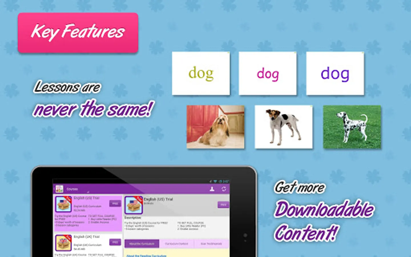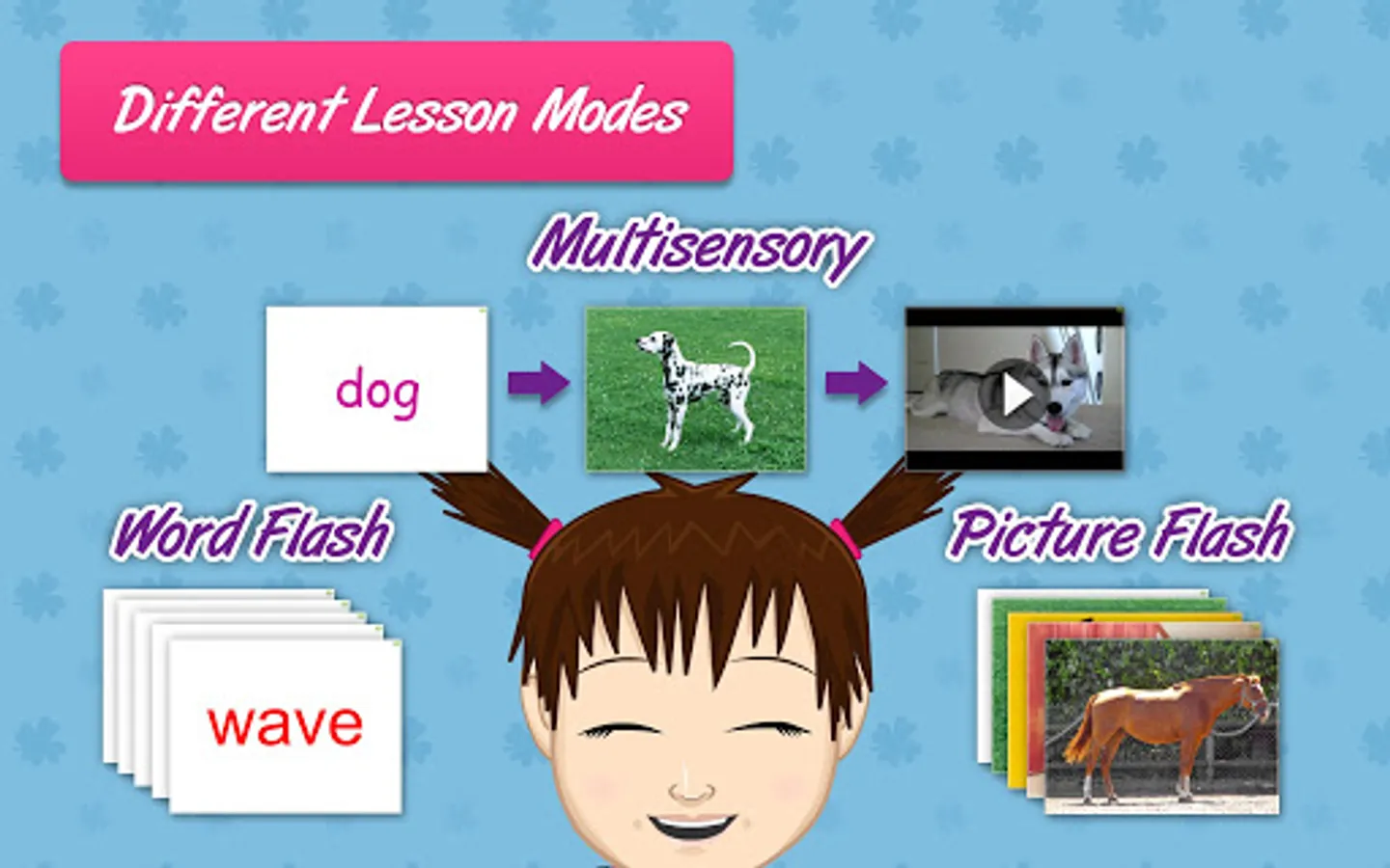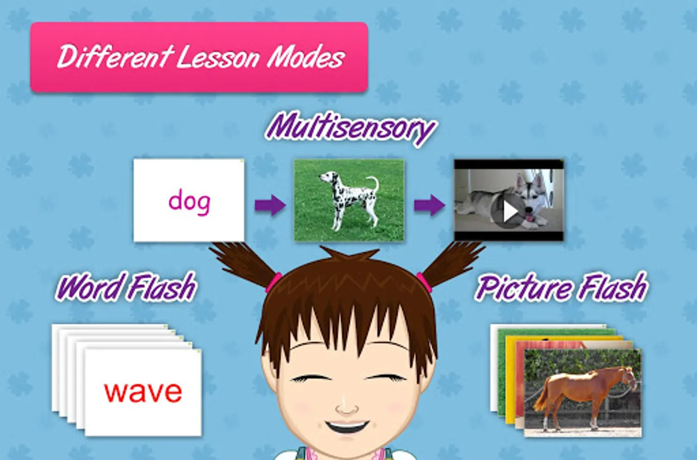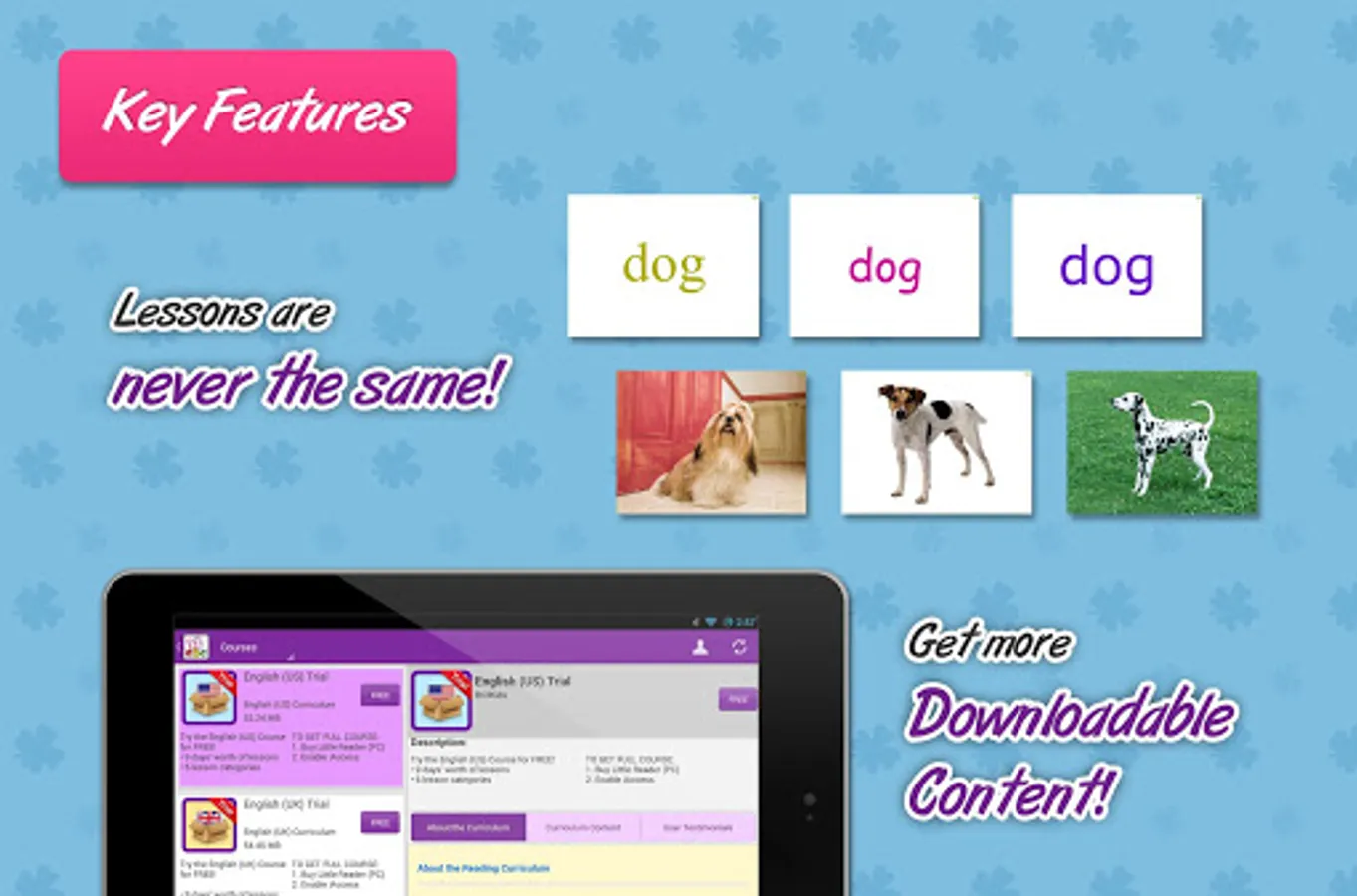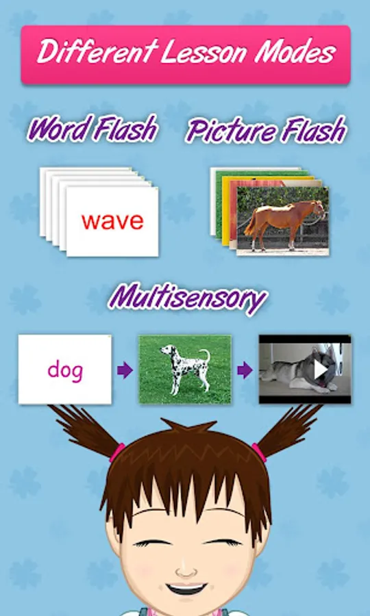 Words are shown in different fonts and colors, and with different pictures, voices and video each time! This variety makes it much more engaging for your child, and helps to give your child a much more comprehensive meaning of the words.