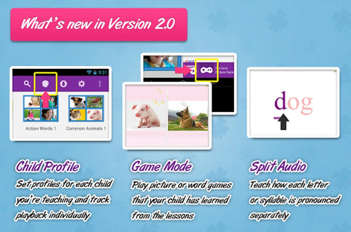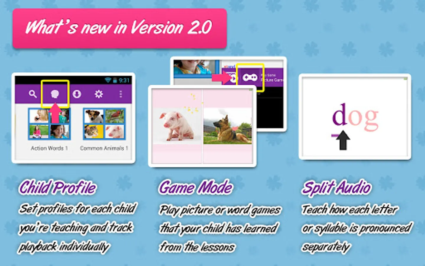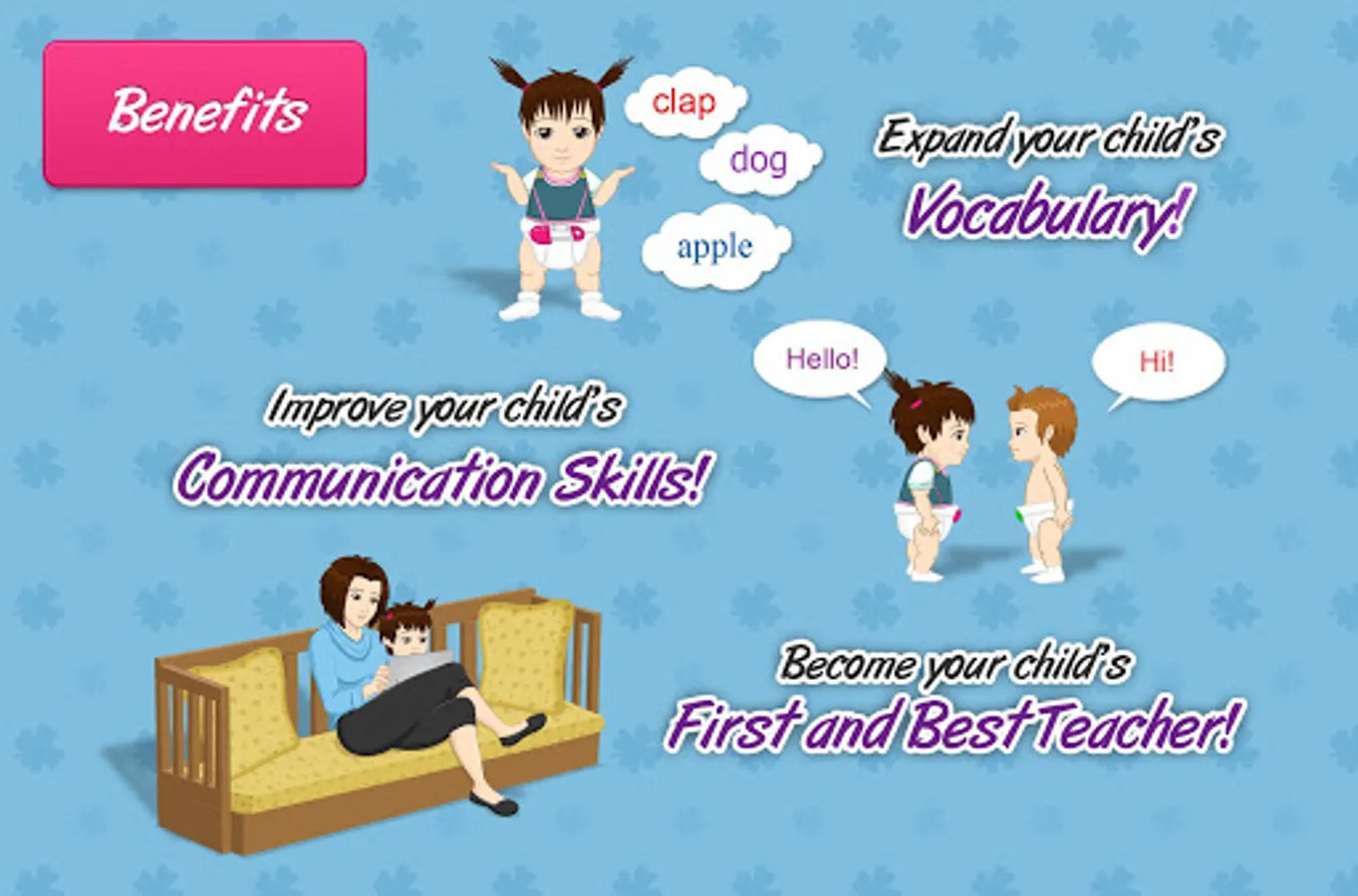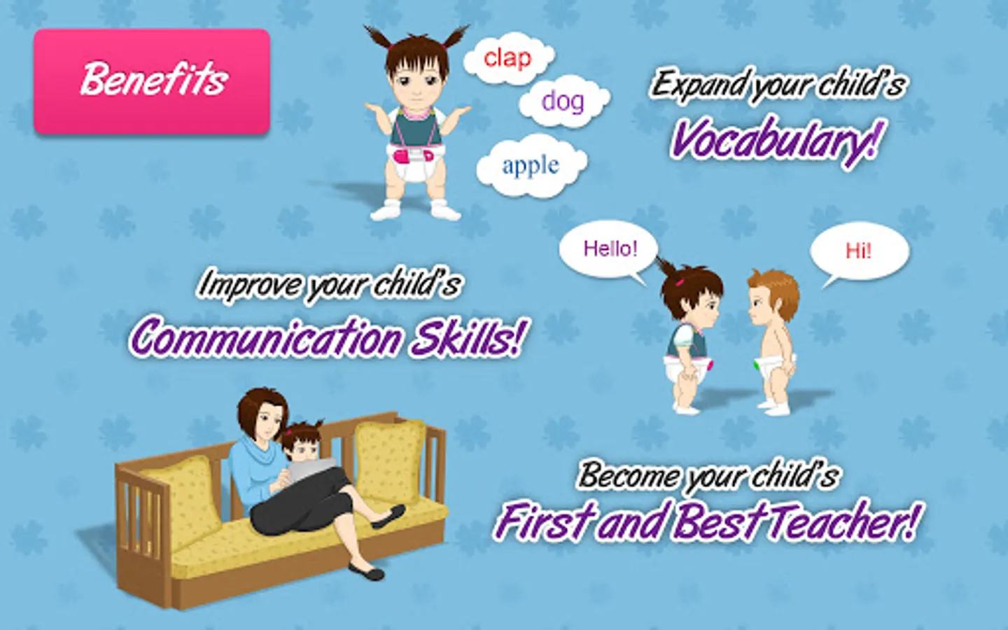 Words are shown in different fonts and colors, and with different pictures, voices and video each time! This variety makes it much more engaging for your child, and helps to give your child a much more comprehensive meaning of the words.
