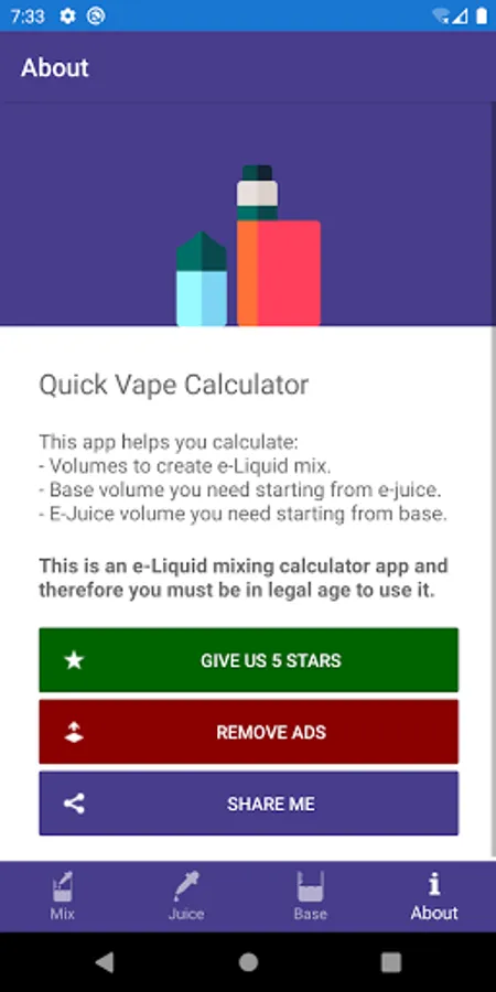 This is an e-Liquid mixing calculator app and therefore you must be in legal age to use it.