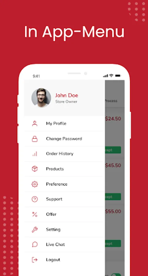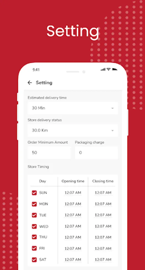 -Manage store details like store time, manage product status, packaging charge, delivery radius, minimum order amount, Estimated delivery time, and more