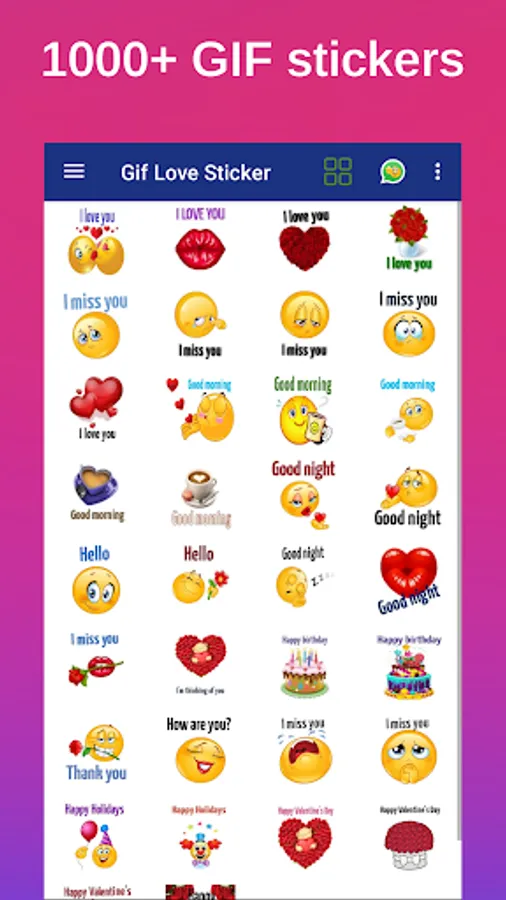 π Except for Love stickers, this app also offers you some other gif stickers for the normal greetings like Hi, Good Morning, Well Done, Happy birthday etc.